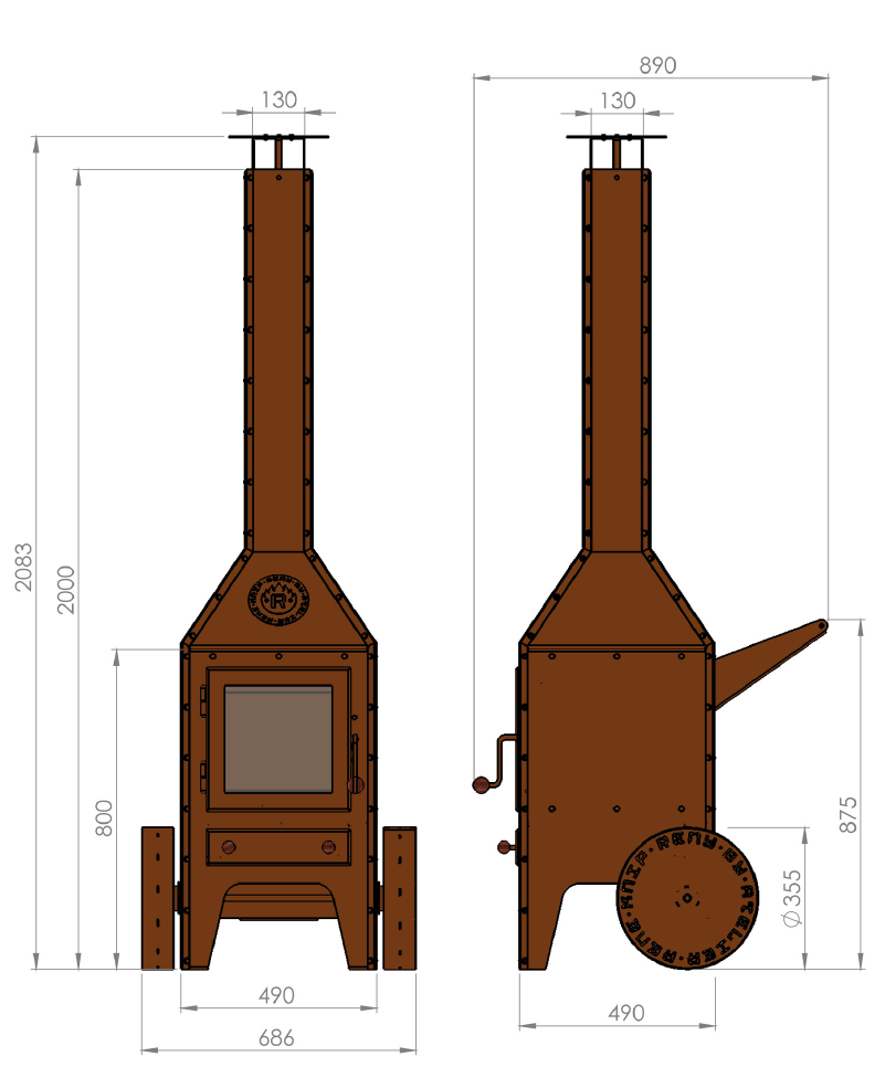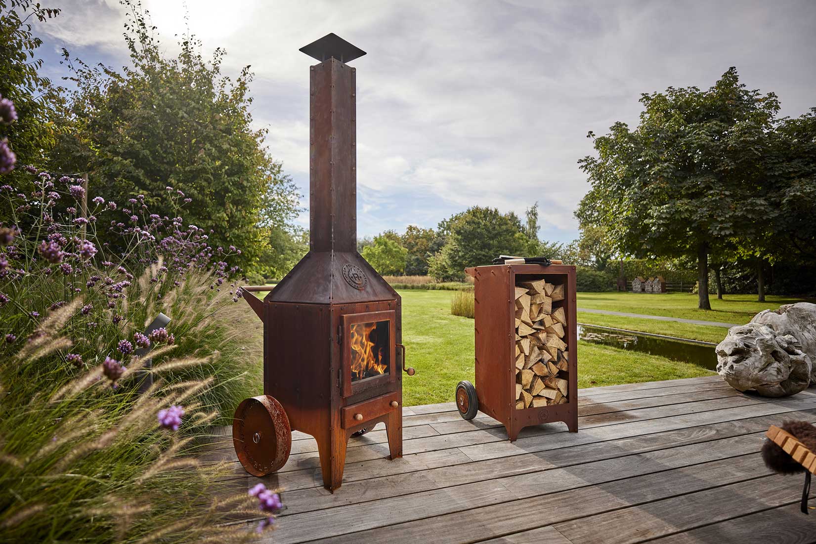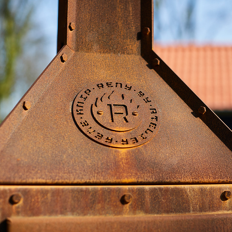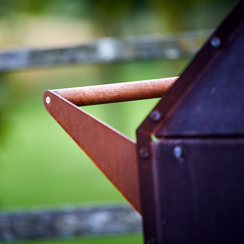 Fogarna på plåtmaterialet är vikta utåt och konstruerade av starkt 3mm CorTen-stål. Alla muttrar och bultar är avsiktligt synliga för att ge utomhuskaminen en robust individuell karaktär.