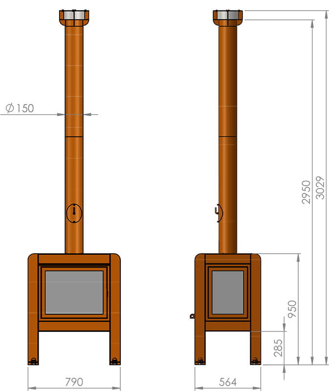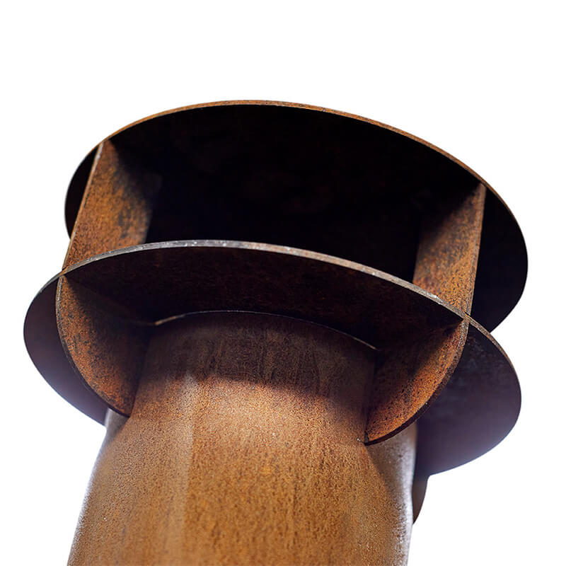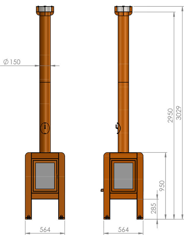 Skorstenen är dränerande, dvs leder bort regnvatten på ett effektivt sätt. Benen är utrustade med stora robusta kapsylmuttrar samt en rostfri bult så att kaminen kan placeras var som helst utan att lämna rostfläckar på terrassen.